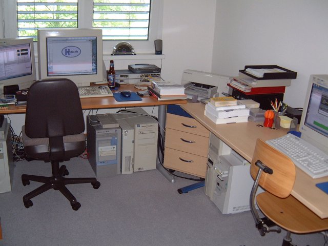 Pentium 3 with 1 GHz (very left), 512 MB RAM, Hauppauge TV card, external SCSI CD burner, 1x Eizo T67S 20" CRT screen, 1x Eizo T57S 17" screen