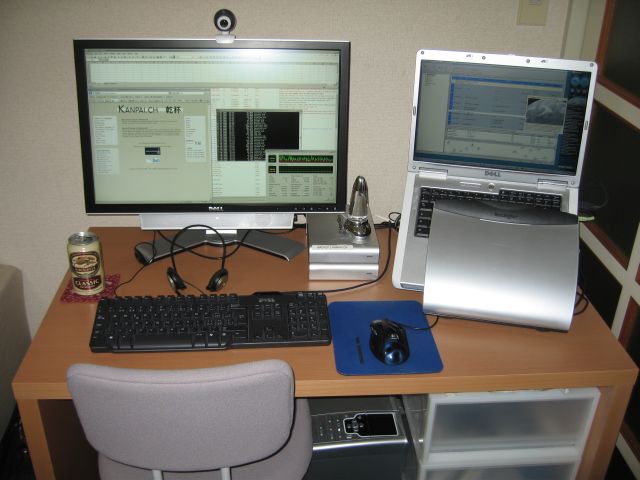 Dell Inspiron 6000 notebook with Pentium M 760 2 GHz, 2 GB RAM, 100 GB HD, 15.4" display with 1680x1050 resolution, Kensington notebook stand, Dell 2407WFP 24" TFT with sound bar